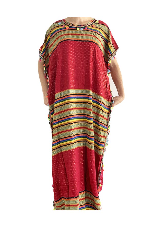 Rot Frau Djellaba mit Golddrucken, Farbstreifen, Stickerei am Kragen und an den Seiten. Diese Djellaba Frau ist bunt und festlich.