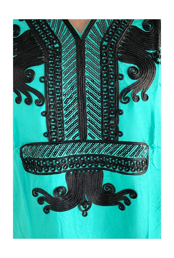 Djellaba mujer verde, bordados y lentejuelas negras. Excelente djellaba brillante que refleja todos los colores que recibe caftan