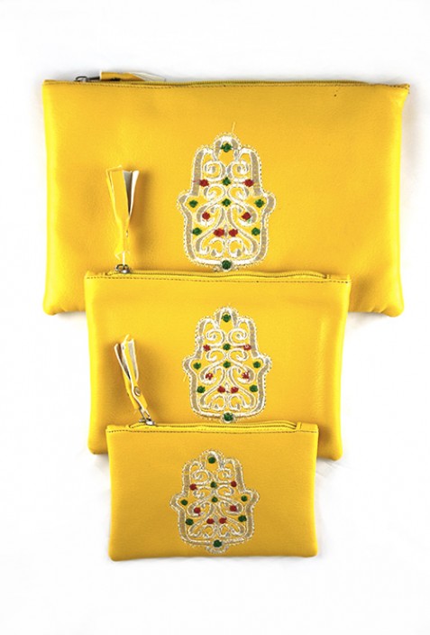 Lot de 3 pochettes en simili cuir jaune sahara. Broderie main de Fatma, usage multiple, porte-monnaie, trousse à maquillage ...