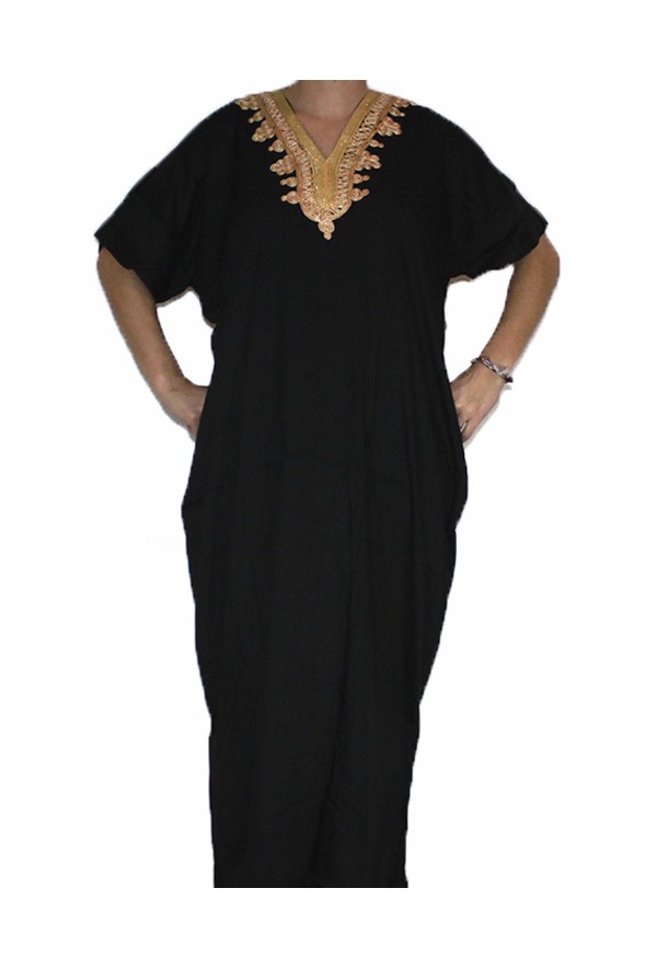 Djellaba traditionnelle femme noir et or Casablanca incarne l'élégance et le raffinement marocain. Disponible en taille unique, elle offre une coupe fluide et des broderies dorées sophistiquées, parfaites pour toutes les occasions.