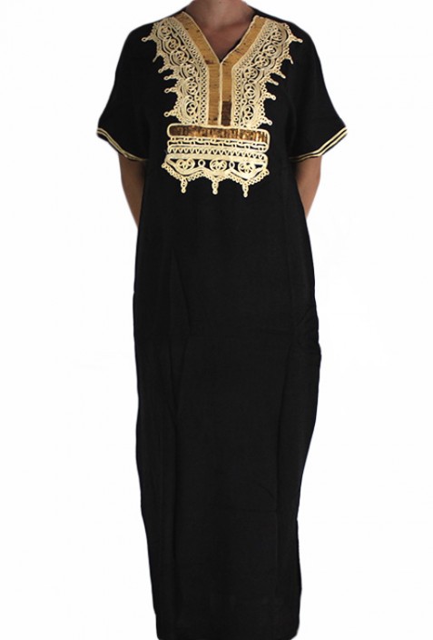Djellaba traditionnelle femme noire et or allie la sophistication du noir et l'éclat de l'or pour une tenue unique. Confectionnée avec soin par nos artisans marocains, elle incarne la parfaite fusion entre élégance intemporelle et modernité.