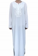 Djellaba traditionnelle bleue à rayures arc en ciel, broderies blanches. Chic et tendance.