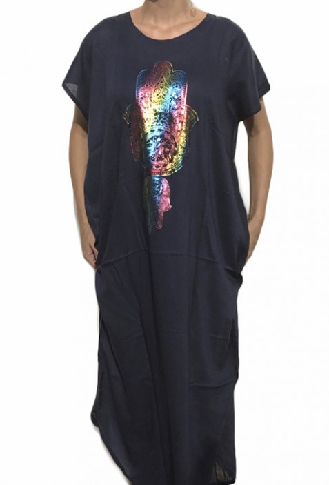 Djellaba traditionnelle en tissu bleue pétrole avec impression main de fatma.